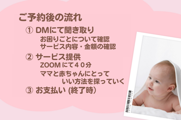 授乳方法、寝かせ方など、ZOOMにて見ながら一緒に解決方法を見つけていきましょう。