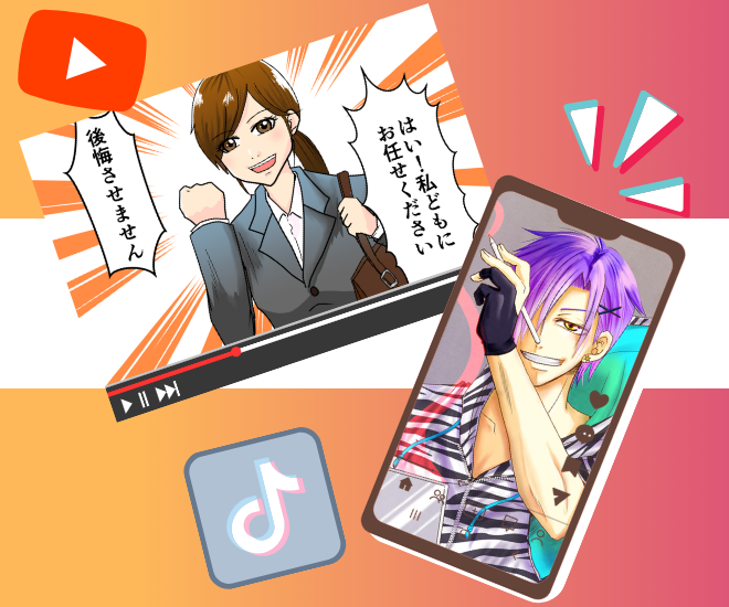 YouTube、TikTokなどの広告漫画、アニメ動画、「歌ってみた」動画やInstagram、Twitterなどで使うイラストまでなんでも作成いたします!