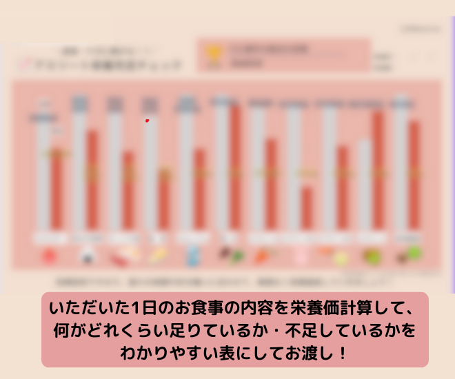 ダイエット目的からメタボ予防の方への減量サポート、現役プロサッカー選手の個別サポートをする管理栄養士が、あなたの現在の食事を30以上の栄養素を分析、詳しく評価。