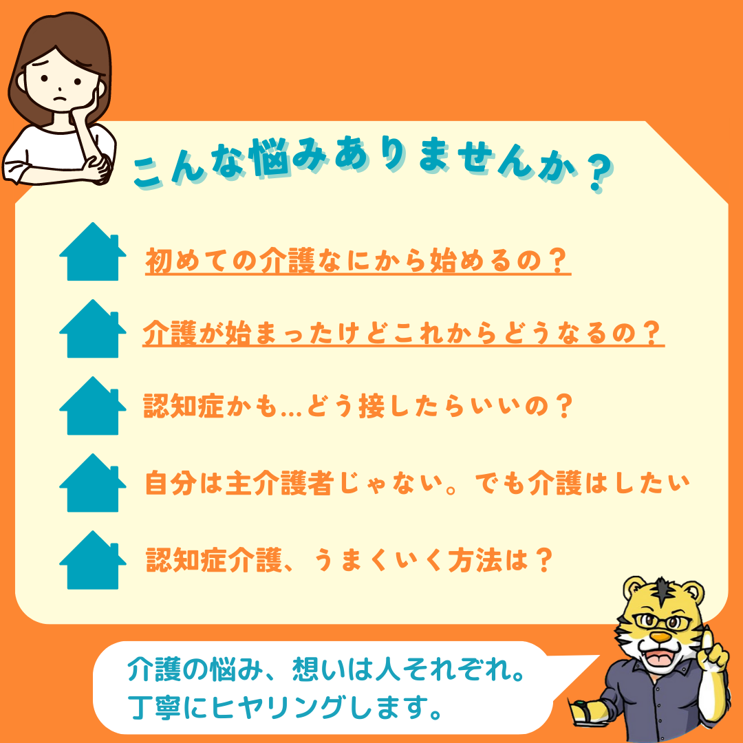 上手に話せない中、優しく何でも思ってい事を言って下さいと、声かけてもらい、心のすみっコにある疑問も話せて良かったです。また、介護状況、気持の変化等出てきた時は相談させてもらいたいです!