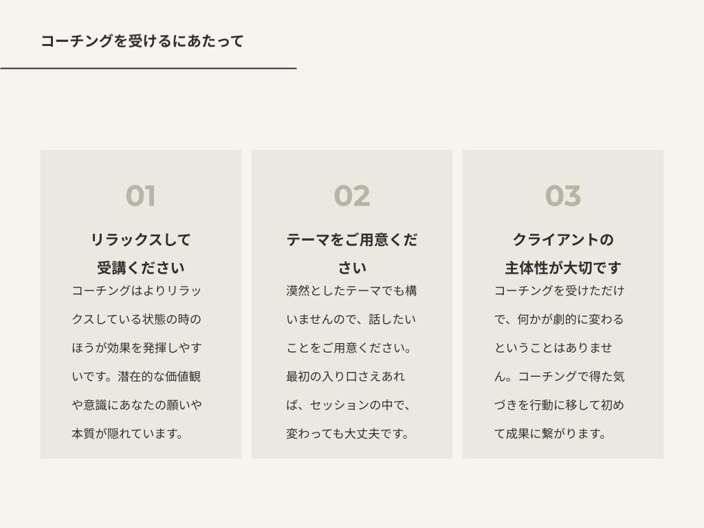 ※こちらは継続者様用のサービスとなります。コーチングはコーチとクライアントの相性が最も大事です。初めての方は、体験セッションを設けていますので、まずはそちらからご受講ください!