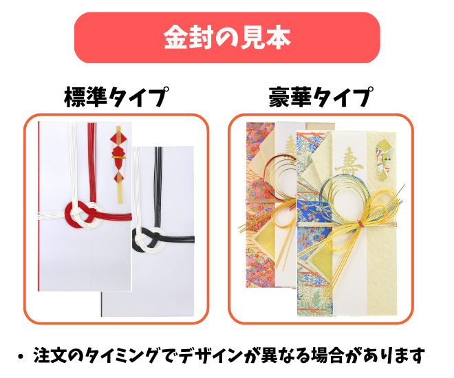 水引付のものや結婚式用などの金封もオプションで用意させていただきます。
