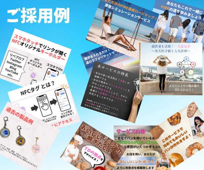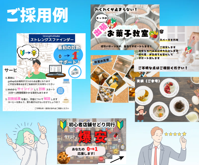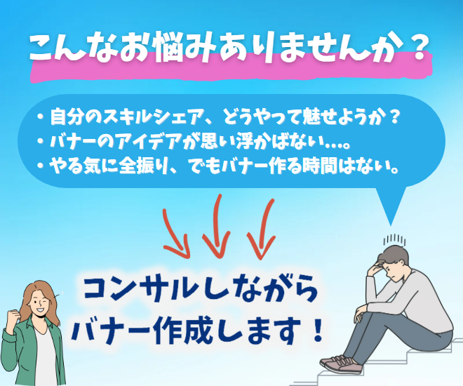 ご自身のスキルを出店するにあたり、「自分のスキルが本当に通用するのか?」「スキルに自信はあるが、バナーでどのように表現すればよいか悩んでしまう」「サービス提供に集中したいから、バナーはお任せで作ってもらいたい」などのご要求に応えられるようご相談できればと考えています。