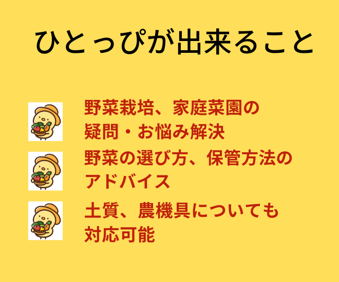 野菜栽培、家庭菜園についての疑問・悩み・質問に丁寧に返答します。 野菜の選び方、保管方法なども聞いてください。 土質や農機具についてもご対応します。 専業農家だからできるアドバイスを提供致します。