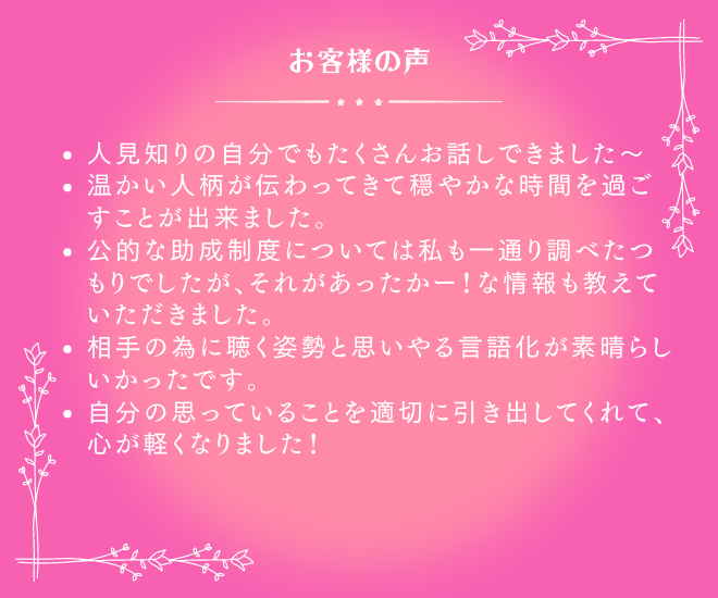 あなたのお悩みに寄り添い、気持ちの整理をしながら、次に自分が何をするべきか少しでも見通しを持ってもらえたら幸いです。