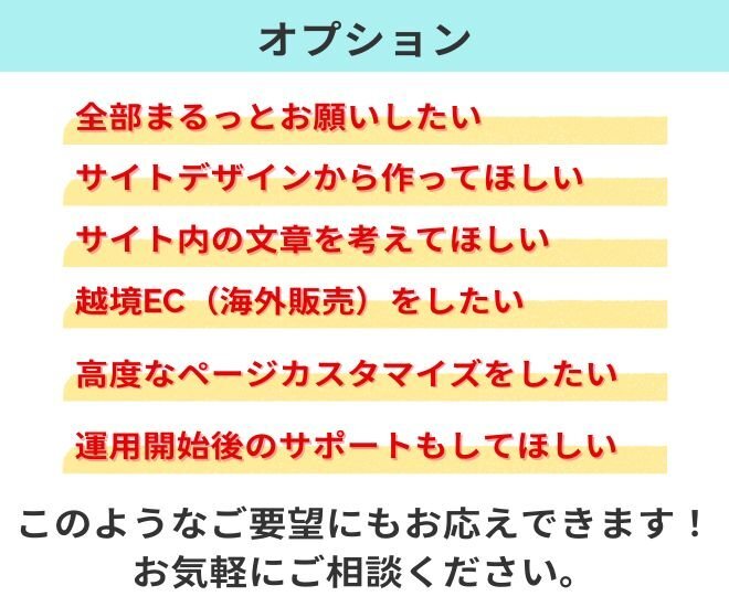 「本気でネットショップを始めたいけど、ECサイトについてよくわからない...」とお悩みの方!制作〜運用までしっかりサポートします。ご要望に沿って柔軟に対応をするのでご安心ください^^