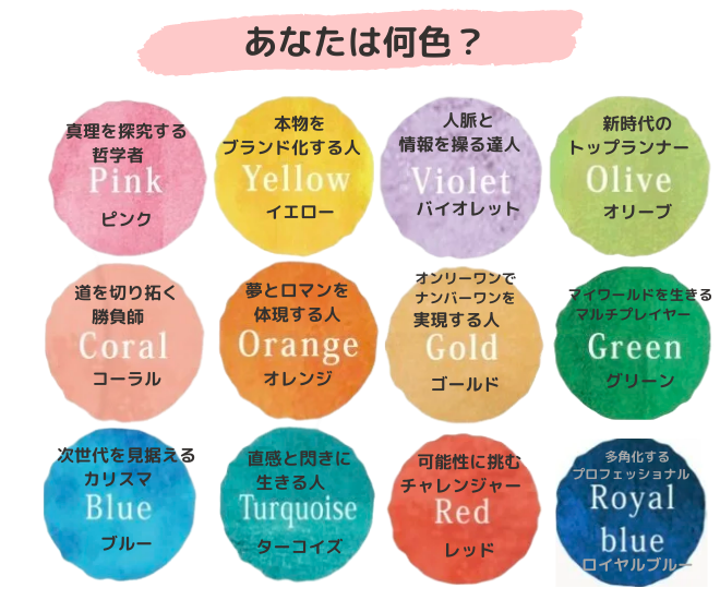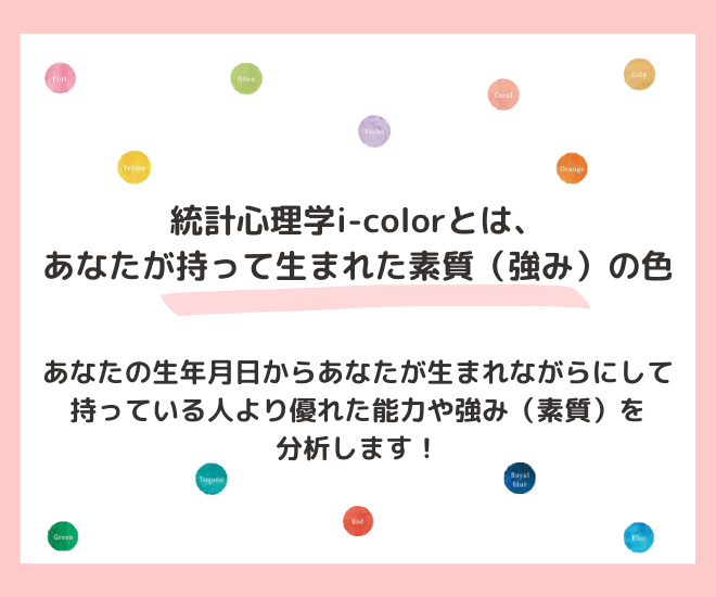 あなたの生年月日から、生まれながらにして持っている人より優れた能力や強み(素質)を分析します! i-colorとは、あなたが持って生まれた素質の色。あなたらしい大輪の花を咲かせるヒントをお伝えします。
