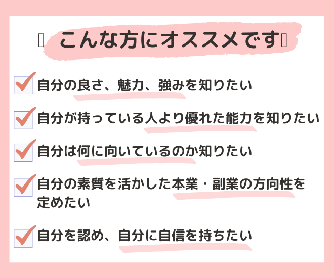 →ご自身の素質(強み)をしっかり掘り下げたい方にオススメです。