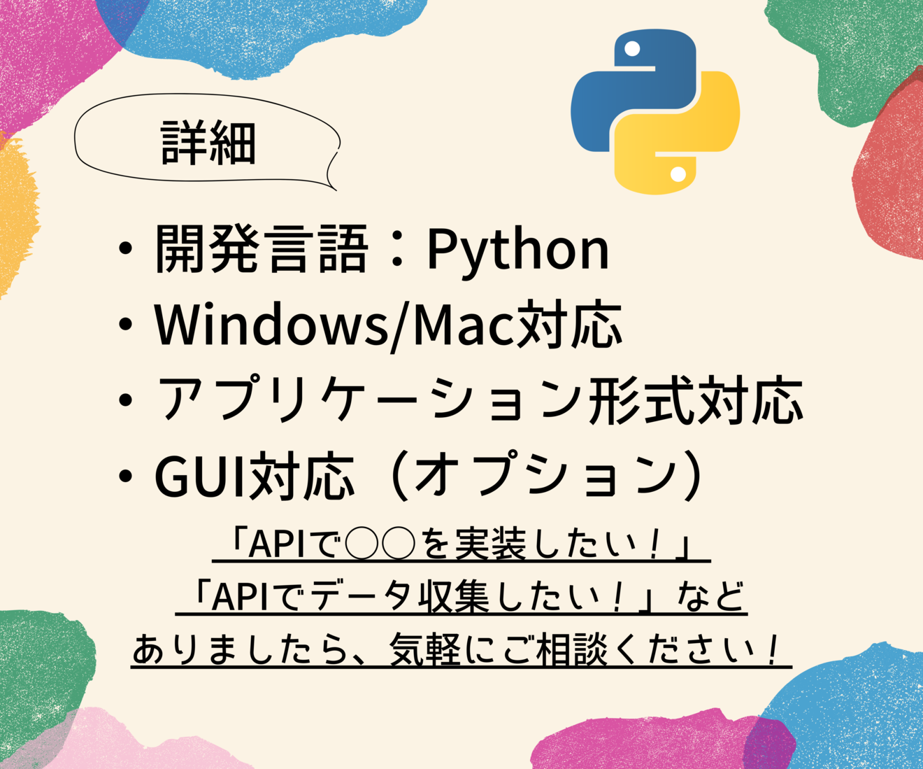 上記の事例以外にも、APIを利用して実現したいがことありましたら、気軽にご相談ください。